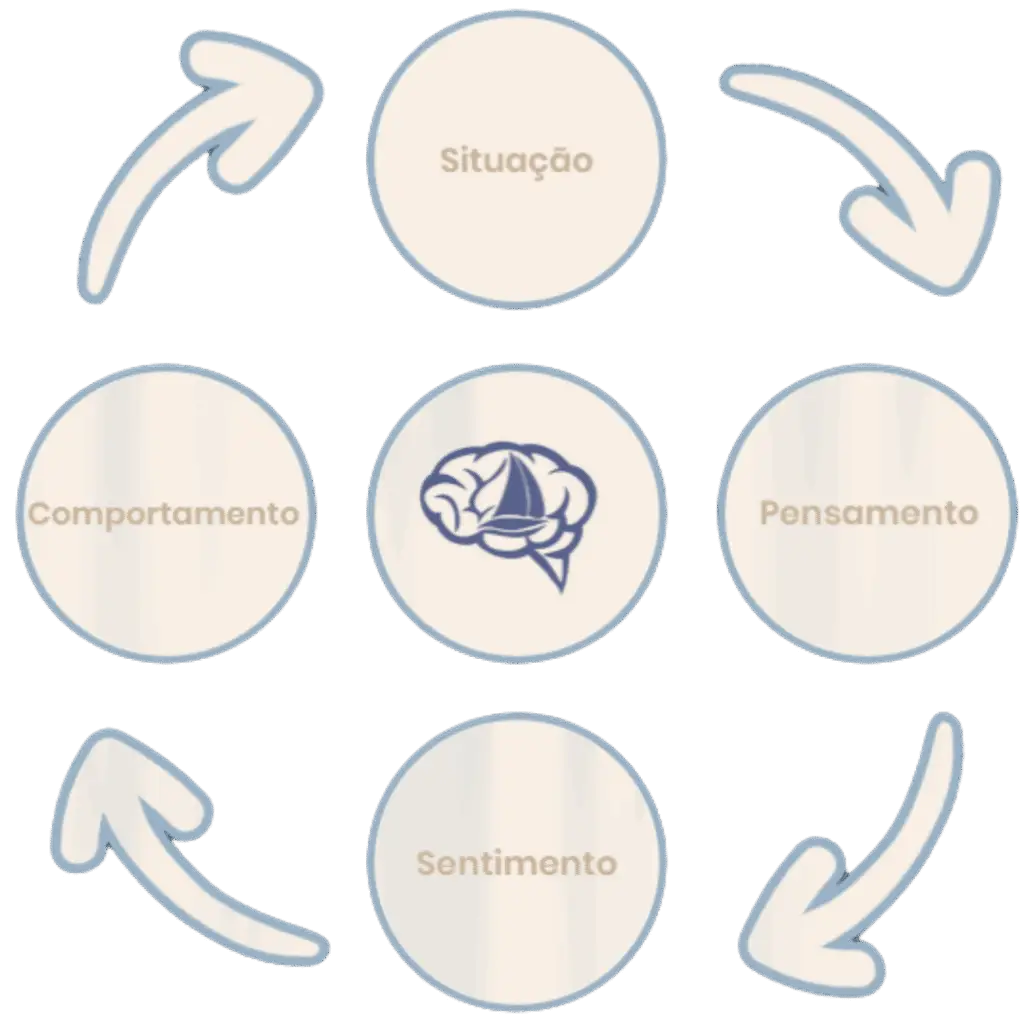 Ela parte da ideia de que nossos pensamentos influenciam o que a gente sente e como a gente age, mais ou menos como na imagem abaixo. E muitas vezes, sem querer, a gente acaba caindo em ciclos de pensamento que só aumentam a ansiedade, a culpa, a autocrítica…